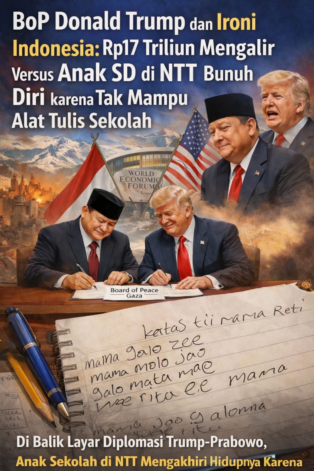 Ketika Presiden Amerika Serikat Donald Trump menggagas Board of Peace (BoP) bersama Benyamin Netanyahu sebagai simbol diplomasi global dan Indonesia ikut menandatangani komitmen tersebut, publik disuguhi narasi besar tentang perdamaian dunia, stabilitas geopolitik, dan tanggung jawab moral negara-negara berkembang. Namun, di saat yang sama, sebuah ironi menyayat nurani bangsa: seorang anak sekolah dasar di Nusa Tenggara Timur memilih mengakhiri hidupnya karena tak mampu membeli buku dan pena (kompas.com, 2 Februari 2026).