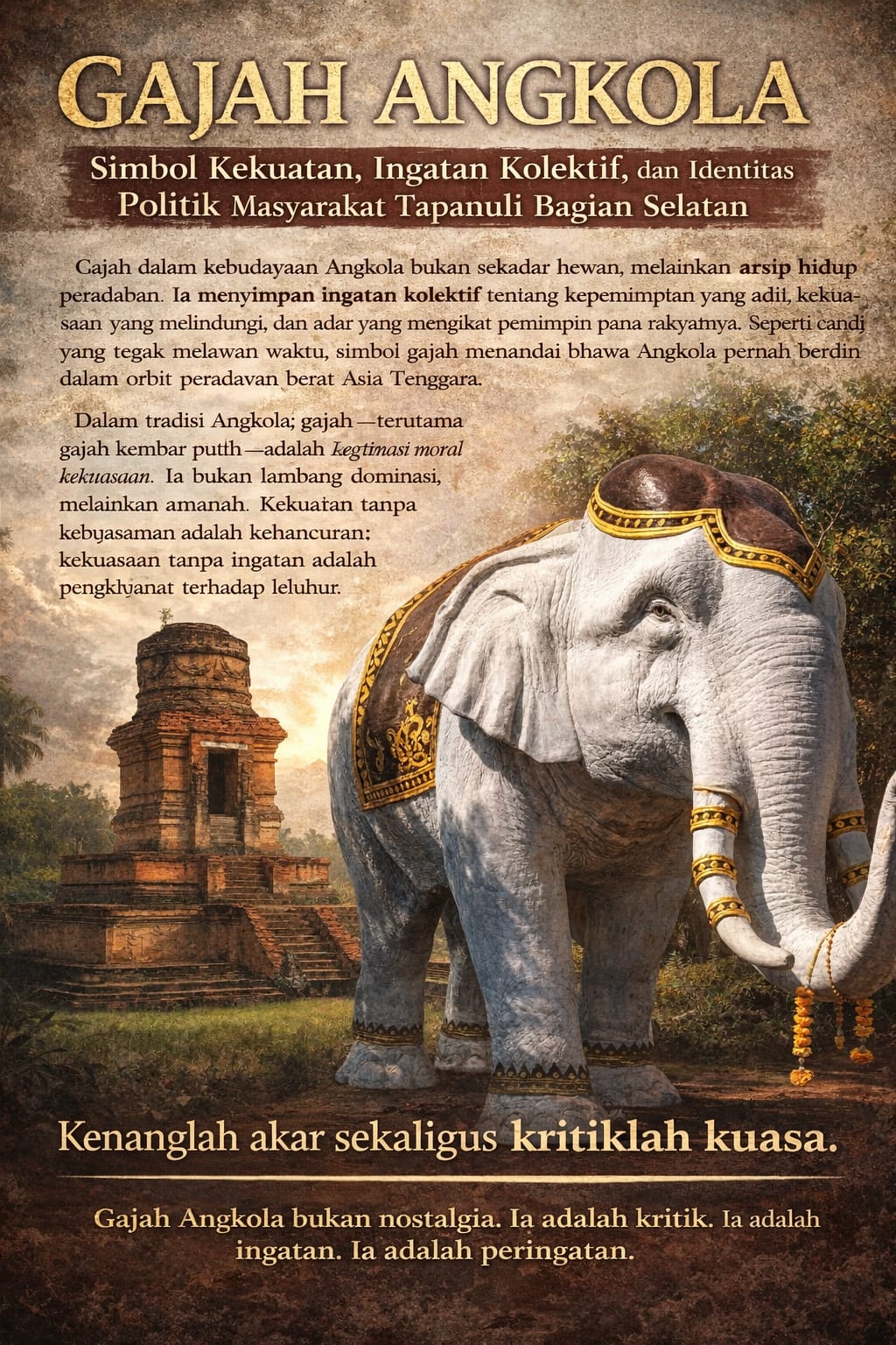 Karena itu, menghidupkan kembali makna gajah Angkola bukanlah romantisme masa lalu, melainkan upaya kritis merebut kembali ingatan kolektif. Di tengah krisis kepemimpinan dan keterputusan sejarah, gajah Angkola mengajukan satu pertanyaan mendasar: masihkah kekuasaan dipahami sebagai amanah untuk melindungi rakyat, atau sekadar alat dominasi dan eksploitasi yang lupa pada jejak-jejak yang pernah membesarkannya.