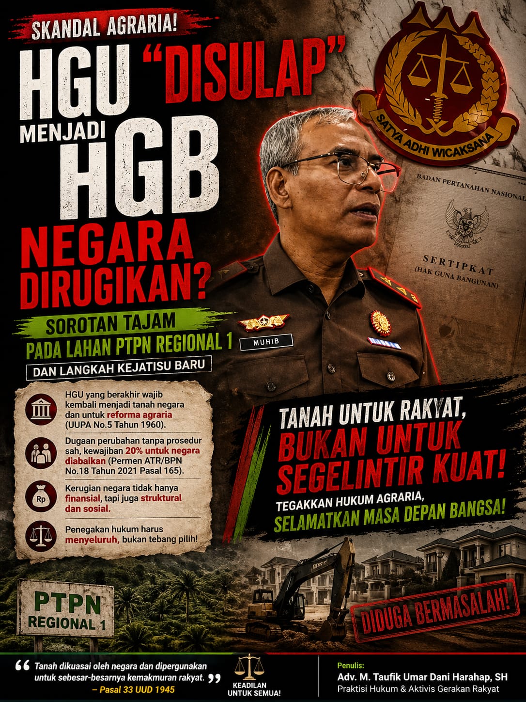 Potret kegelisahan publik atas tata kelola agraria yang kian menjauh dari mandat konstitusi. Kasus dugaan perubahan status Hak Guna Usaha (HGU) menjadi Hak Guna Bangunan (HGB) di kawasan PTPN Regional 1 membuka kembali luka lama: relasi kuasa antara negara, korporasi, dan rakyat dalam penguasaan tanah. Di tengah agenda reforma agraria yang dijanjikan, praktik-praktik administratif yang “melompat prosedur” justru menimbulkan pertanyaan mendasar—apakah hukum masih menjadi panglima, atau sekadar instrumen legitimasi kekuasaan ekonomi?.