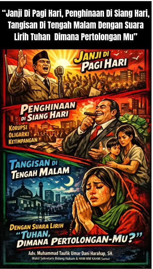 Doa di malam hari dari rakyat banyak dengan lirih “Tuhan, dimana pertolongan-Mu?” bukan sekadar ekspresi spiritual, tetapi juga sinyal kegagalan institusional. Dalam perspektif sosiologi politik, ketika kepercayaan terhadap negara menurun, masyarakat cenderung mencari sandaran di luar sistem formal—baik itu agama, komunitas lokal, atau bahkan populisme. Ini bukan masalah iman, melainkan indikator bahwa negara belum sepenuhnya hadir sebagai penjamin keadilan substantif.