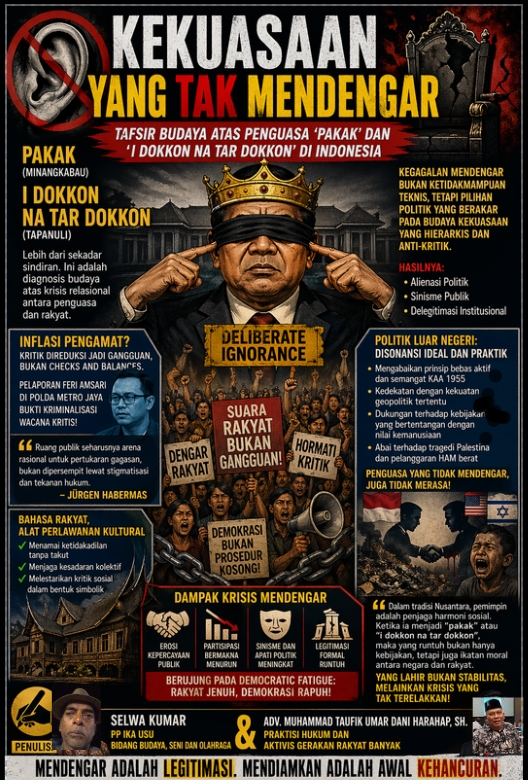 Fenomena kekuasaan yang tidak responsif terhadap aspirasi publik bukan sekadar persoalan politik praktis, melainkan problem kultural yang berakar dalam relasi antara penguasa dan rakyat. Dalam khazanah lokal, istilah ‘pakak’ dari Minangkabau dan ‘i dokkon na tar dokkon’ dari Tapanuli menghadirkan kritik tajam yang melampaui bahasa formal politik. Ia adalah ekspresi antropologis—bahwa ketika kekuasaan kehilangan kemampuan mendengar, ia sesungguhnya sedang kehilangan legitimasi sosialnya.