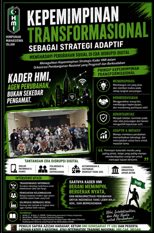 Pada akhirnya, kepemimpinan transformasional adalah keniscayaan sejarah di tengah disrupsi yang tak memberi ruang bagi keraguan. Kader HMI dihadapkan pada pilihan tegas: menjadi subjek perubahan yang menapaki jalan hanif—lurus dalam tauhid, jernih dalam integritas, dan konsisten dalam kebenaran—atau larut sebagai objek dalam arus yang mereka gagal arahkan. Independensi etis himpunan tidak boleh berhenti sebagai slogan, melainkan harus menjelma dalam intervensi nyata yang terukur dan berdampak. Relevansi kader tidak lagi ditentukan pada keterampilan retorika yang nyaring, tetapi oleh keberanian mengeksekusi gagasan, menyelesaikan problem konkret, dan menjaga kesetiaan pada nilai-nilai kebenaran di tengah godaan kekuasaan. Di titik ini, kepemimpinan bukan soal posisi, melainkan komitmen: menjadi penggerak perubahan yang nyata, terukur, dan berdampak atau sekadar penonton dalam sejarah yang bergerak tanpa menunggu.