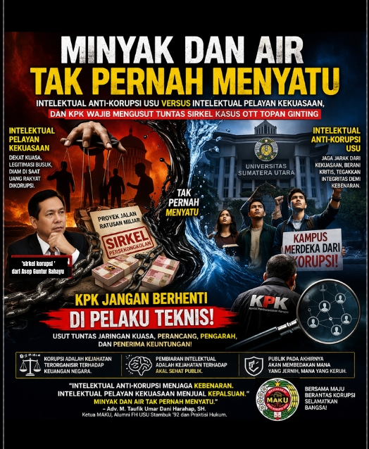 Pada akhirnya, garis pemisah itu kembali menjadi jelas: antara yang menjaga kebenaran dan yang membungkus kepalsuan dalam pembiaran dan penikmat korupsi uang rakyat. Kasus Topan Obaja Putra Ginting bukan hanya ujian bagi aparat penegak hukum, tetapi juga bagi komunitas intelektual yang tergabung dalam masyarakat Anti Korupsi USU (MAKU) dan Indonesia secara luas. Jika korupsi adalah kejahatan kera putih yang terorganisir dan sistemik terhadap keuangan negara, maka pembiaran dan pembenaran oleh intelektual adalah kejahatan terhadap akal sehat publik. Dan seperti minyak dan air, keduanya tidak akan pernah menyatu—publik pada akhirnya akan mampu membedakan mana yang jernih, dan mana yang keruh.