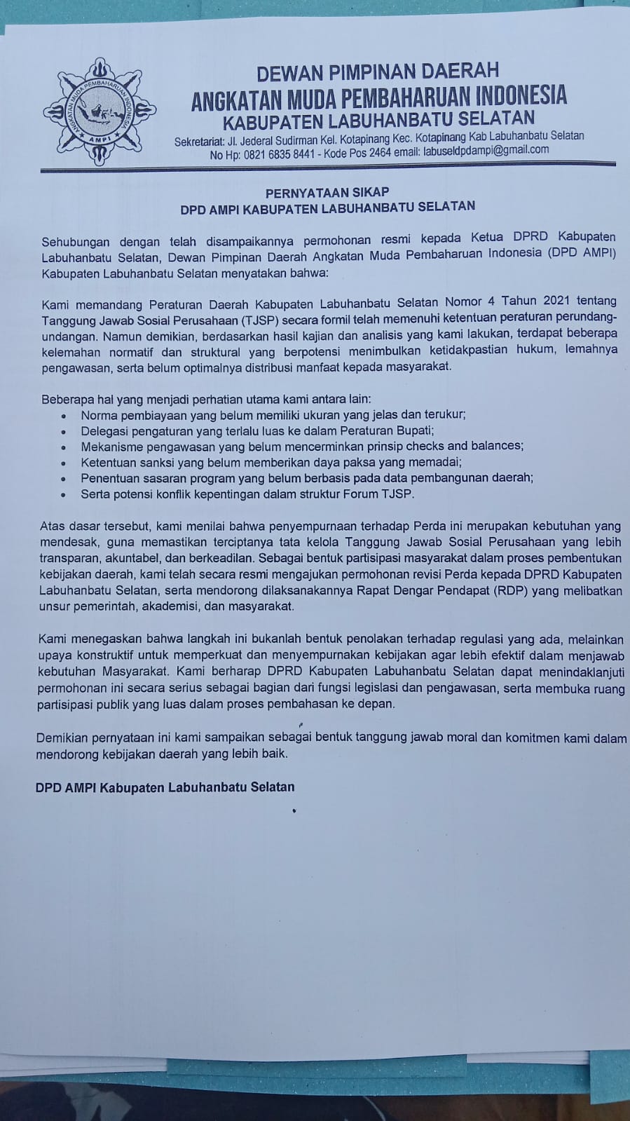Dewan Pimpinan Daerah Angkatan Muda Pembaharuan Indonesia (DPD AMPI) Kabupaten Labuhanbatu Selatan (Labusel) mengusulkan revisi Peraturan daerah (Perda) Nomor 4 Tahun 2021 tentang Tanggung Jawab Sosial Perusahaan (TJSP) kepada DPRD Labusel.