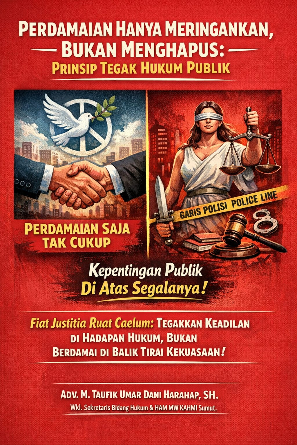 Akhirnya, perspektif teori hukum publik, asas Fiat Justitia Ruat Caelum pada akhirnya bermuara pada cita negara hukum—rechstaat—di mana hukum berdiri di atas segala kepentingan kekuasaan. Negara hukum menuntut konsistensi bahwa setiap dugaan pelanggaran yang menyangkut kepentingan publik harus diuji secara terbuka, objektif, dan akuntabel di hadapan hukum, bukan diselesaikan melalui kompromi politik atau perdamaian pragmatis yang berpotensi menutup kebenaran. Ketika hukum mulai tunduk pada pertimbangan kekuasaan, legitimasi institusi negara perlahan terkikis dan kepercayaan publik runtuh. Karena itu, jalan menuju rechstaat tidak dapat ditempuh melalui negosiasi keadilan, melainkan melalui keberanian menegakkan hukum secara konsisten—bahkan ketika penegakan itu tidak nyaman bagi kekuasaan. Perdamaian mungkin meredakan konflik sosial, tetapi dalam negara hukum sejati, keadilan tetap harus diuji, diputuskan, dan ditegakkan di hadapan hukum.