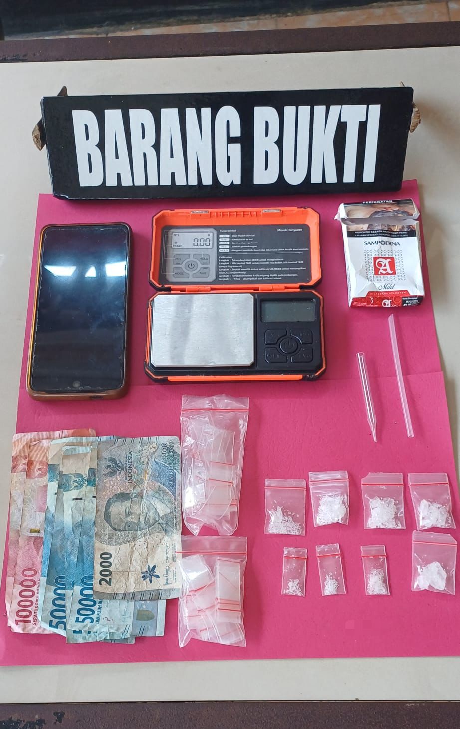 Melalui pengembangan, petugas kemudian menangkap tersangka kedua, DS, yang diduga sebagai pemasok. Dari penggeledahan, petugas menyita sejumlah barang bukti, antara lain: delapan bungkus plastik klip berisi sabu dengan total berat 6,23 gram, satu unit timbangan elektrik, plastik klip kosong, kaca pyrex, pipet/skop, satu unit telepon genggam, uang tunai Rp402.000, serta dua unit sepeda motor yang digunakan para pelaku.