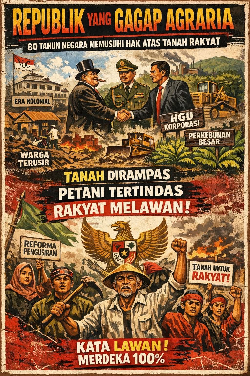Pada akhirnya, republik ini tidak kekurangan regulasi; ia kekurangan keberanian politik untuk sungguh-sungguh berpihak. Ketika dua hektare di tangan petani kecil dicurigai sebagai ancaman, sementara ribuan, ratusan ribu bahkan jutaaan hektare dalam konsesi korporasi dianggap wajar demi “pertumbuhan”, kita sedang merawat ketidakadilan struktural yang dilegalkan. Semangat Undang-Undang Pokok Agraria sejatinya menempatkan tanah sebagai alat keadilan sosial, bukan instrumen akumulasi modal. Dekolonialisasi hukum agraria karena itu bukan sekadar mencabut warisan pasal kolonial, melainkan membongkar cara pandang negara agar kembali melihat tanah sebagai ruang hidup rakyat. Tanpa keberpihakan itu, 80 tahun usia bersama Indonesia hanya menjadi himpitan kemiskinan yang sengaja di buat atasnama Burung Garuda; dan bagi rakyat, sejarah selalu memberi pelajaran tegas: diam terhadap penindasan adalah bentuk pengkhianatan. Hanya satu Kata Lawan !. Merdeka 100 %.