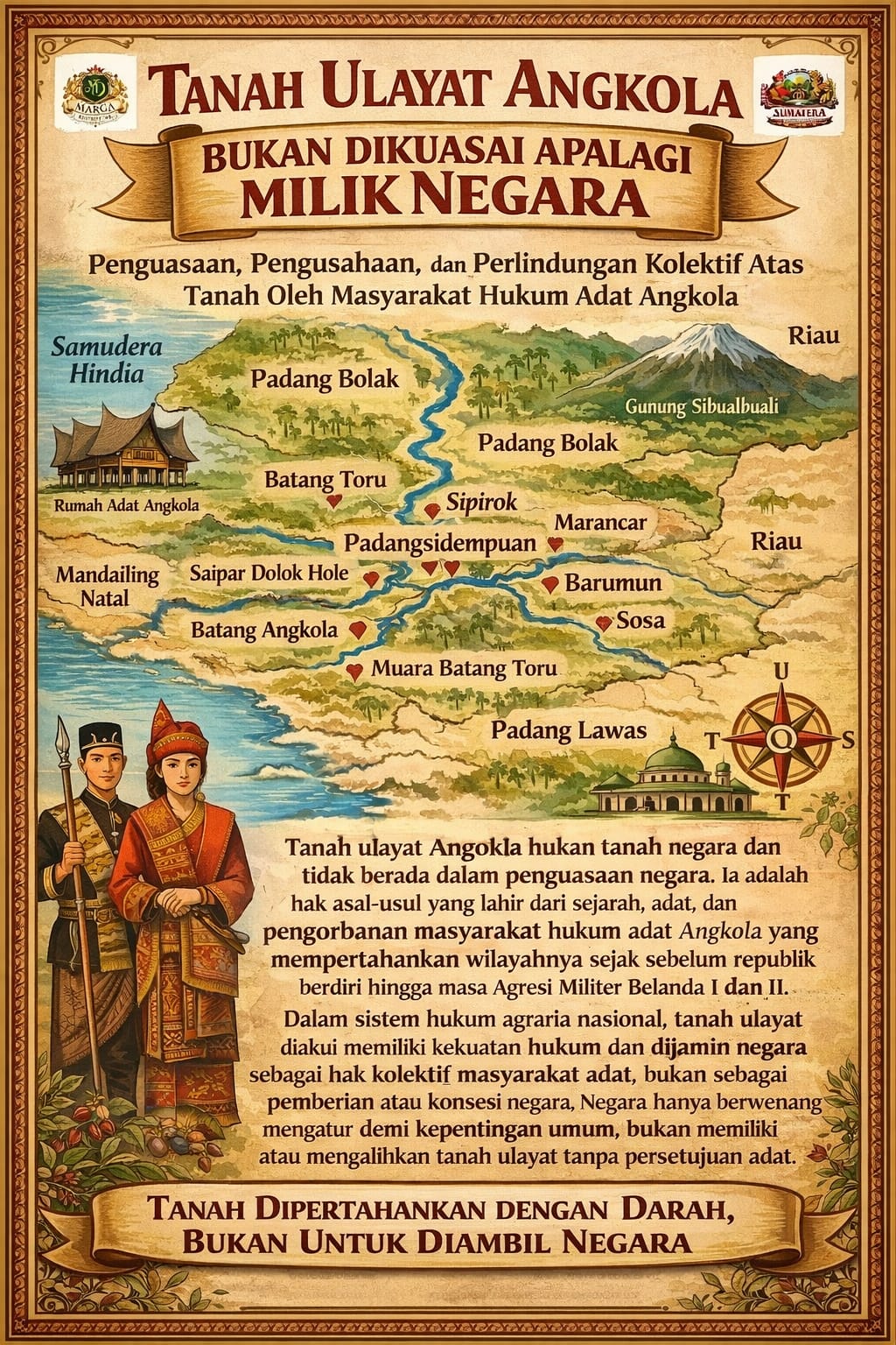 Kesetiaan masyarakat Angkola terhadap Republik Indonesia bukan retorika pascakemerdekaan, melainkan fakta historis yang teruji dalam perlawanan bersenjata selama Agresi Militer Belanda I dan II, ketika wilayah Angkola di Tapanuli Bagian Selatan tidak pernah tunduk pada kekuasaan kolonial, bahkan saat Soekarno dan Mohammad Hatta ditangkap dan Belanda kembali membonceng NICA untuk mengklaim kekuasaan. Dalam situasi krisis itu, perlawanan rakyat Angkola tetap bergelora, mempertahankan wilayah adat sebagai ruang hidup dan basis kedaulatan rakyat. Fakta ini krusial secara yuridis dan konstitusional: tanah yang dipertahankan dengan darah dan pengorbanan tidak pernah diserahkan kepada negara kolonial, dan karenanya tidak pernah pula dilepaskan kepada negara Indonesia merdeka tanpa persetujuan masyarakat hukum adatnya. Dalam sistem hukum adat Angkola, tanah ulayat dikuasai, diusahakan, dan dilindungi secara kolektif oleh kesatuan adat; negara tidak berposisi sebagai pemilik, melainkan sebagai pengatur yang wajib menghormati hak asal-usul. Karena itu, setiap bentuk pengelolaan, pengusahaan, atau alih fungsi tanah ulayat Angkola tanpa persetujuan adat bukan hanya cacat prosedur, tetapi juga mengingkari sejarah perjuangan kemerdekaan dan melanggar prinsip konstitusional pengakuan terhadap masyarakat hukum adat.